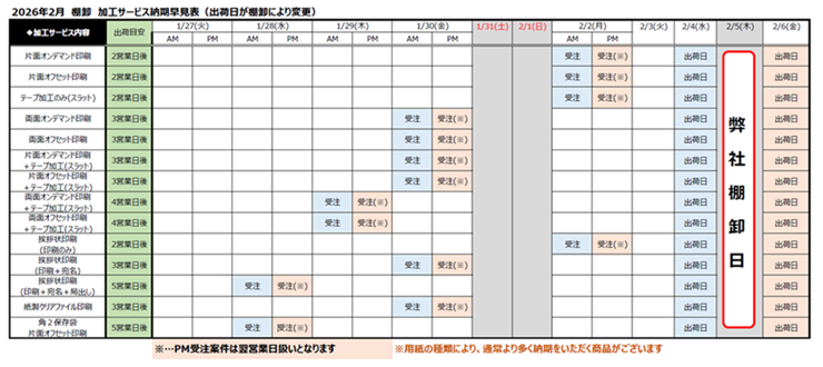 ◆下記日程でご発注いただいた場合、加工日数に影響が出ますのでご注意ください。